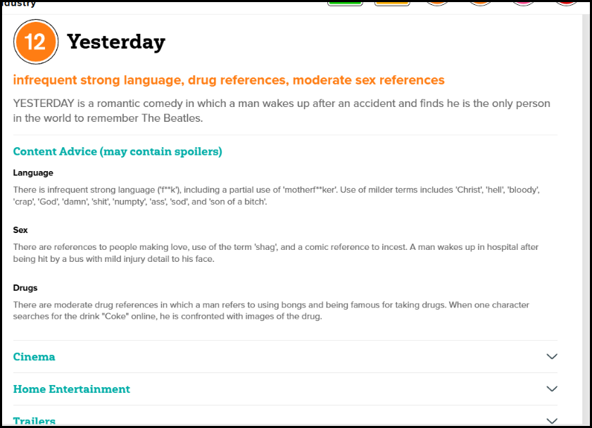 If you click on the rating symbol (as above) on the web page a window will open with the rationale applied by BBFC and possible a link to other details.